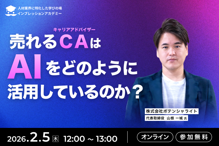 2026年2月5日 / Last updated : 2026年1月6日 正宏木村 セミナー・勉強会スペシャルイベントオンラインお知らせ 【ウェビナー】売れるCA(キャリアアドバイザー)はAIをどのように活用しているのか? 売れるCA(キャリアドバイザー)はAIをどのように活用しているのか? ~人材紹介におけるAIエージェ […]
